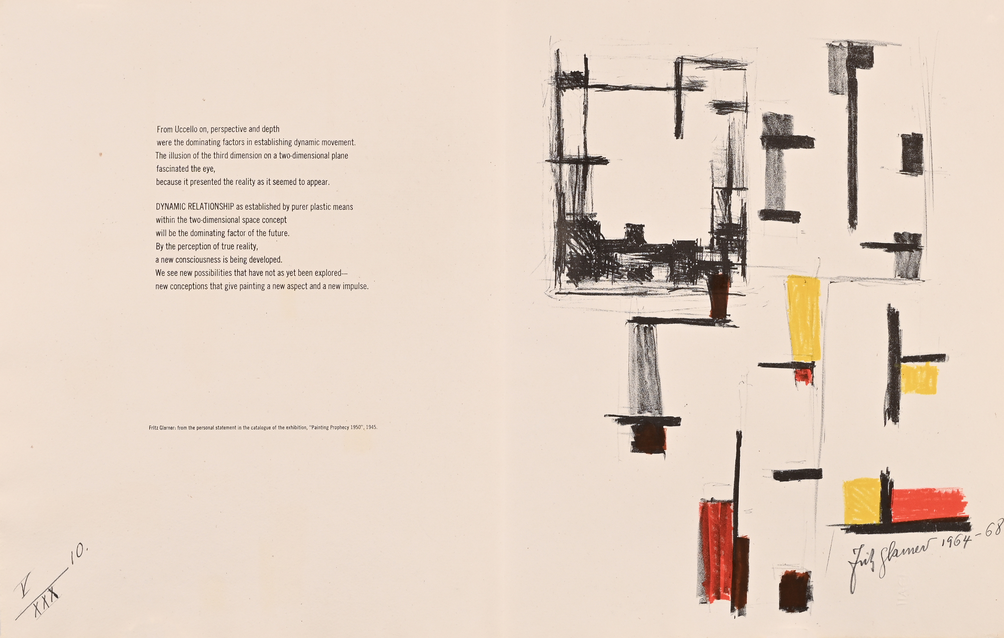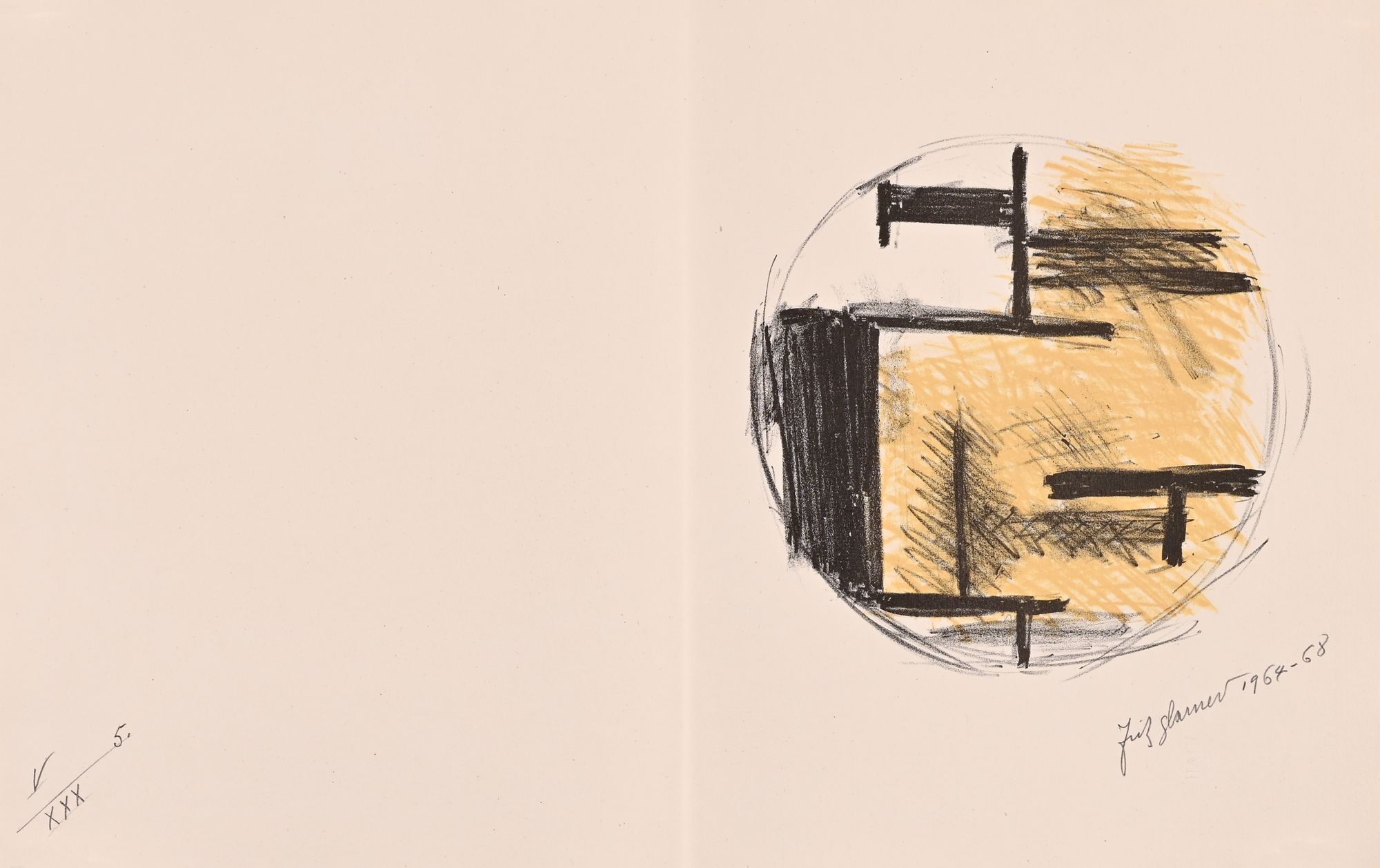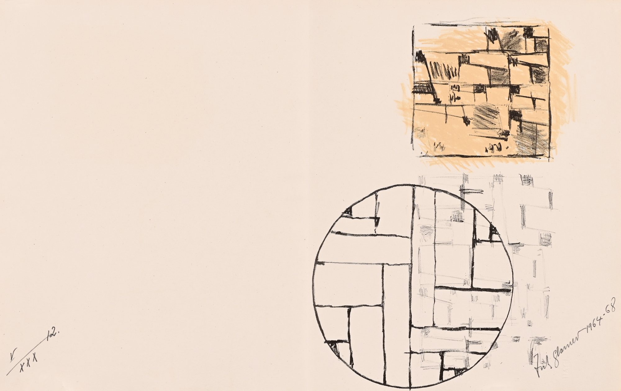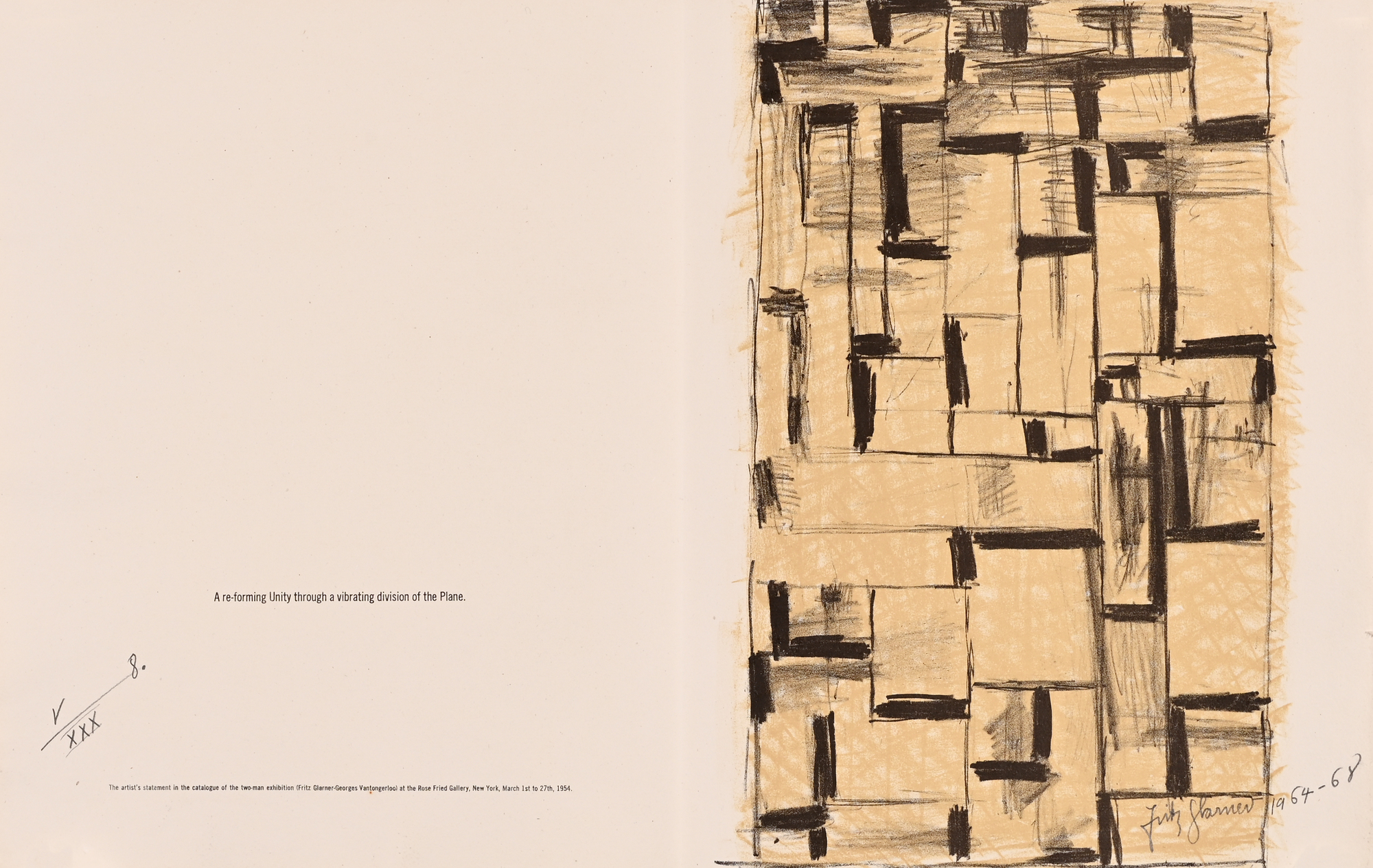 14 Lithografien auf handgeschöpftem Angoumois-Papier, davon 11 in Farbe. Alle Blätter H 360 mm B 570 mm. Auf dem Umschlag handschriftlich nummeriert: V/XXX. Jedes Blatt signiert und datiert: Fritz Glarner 1964–68. Mit Umschlag, Titelblatt und Kolophon.