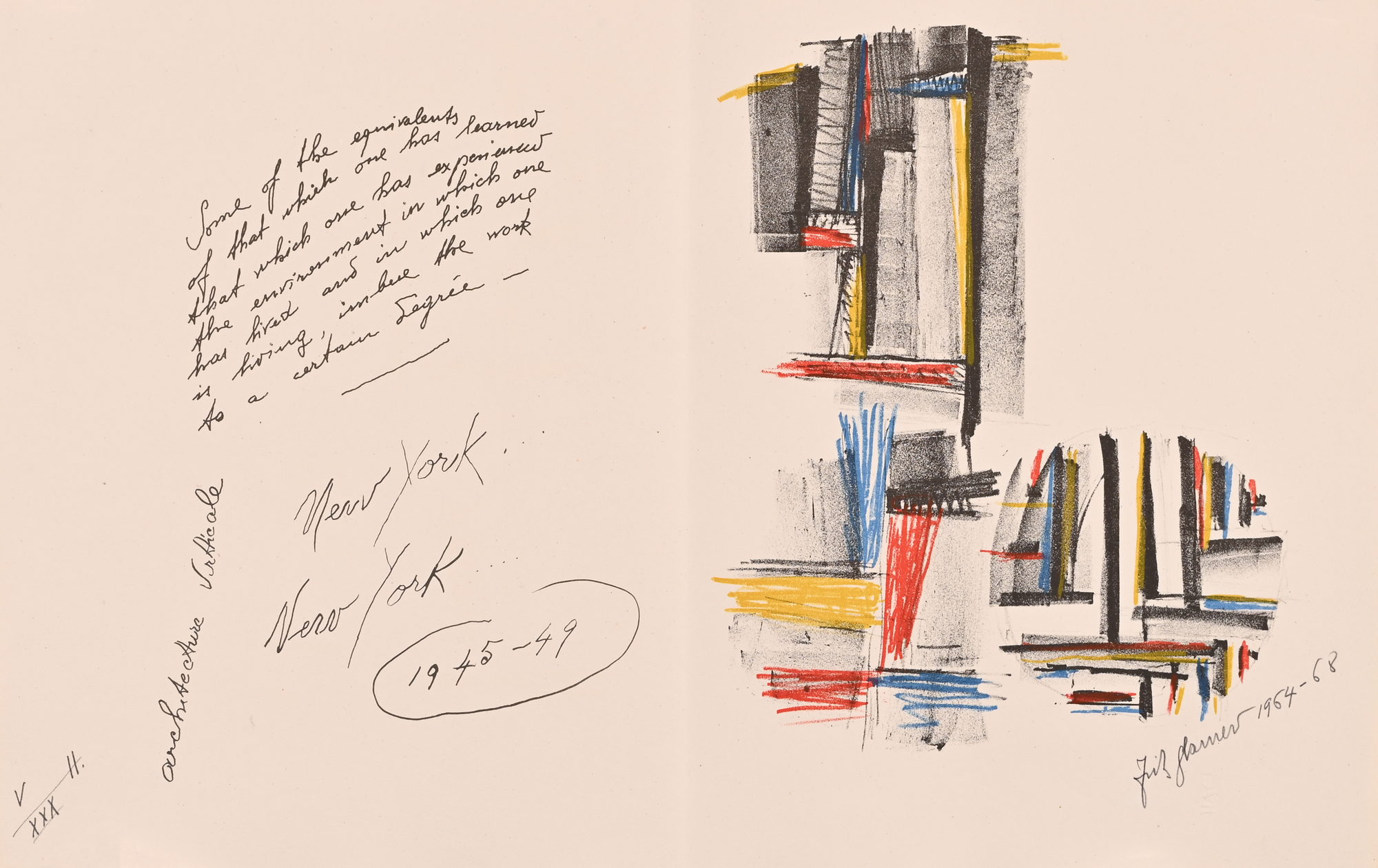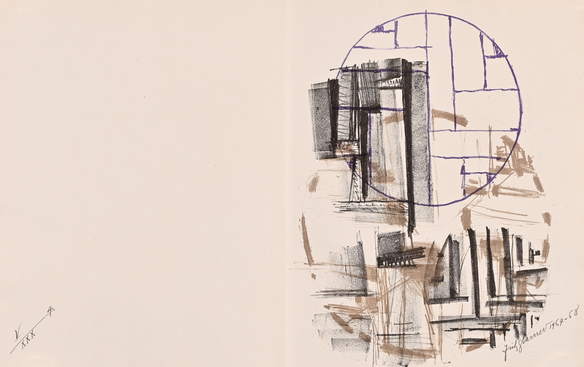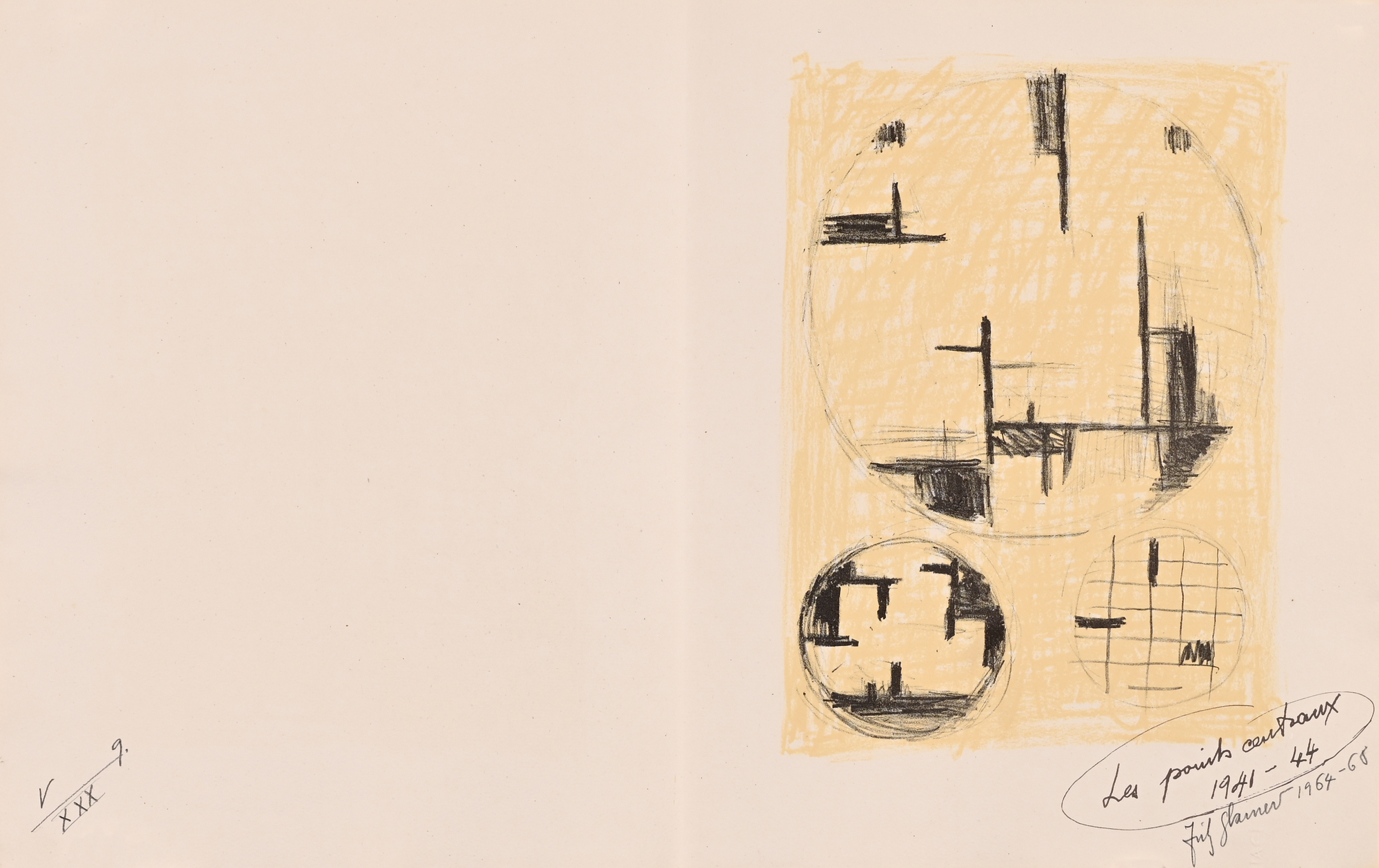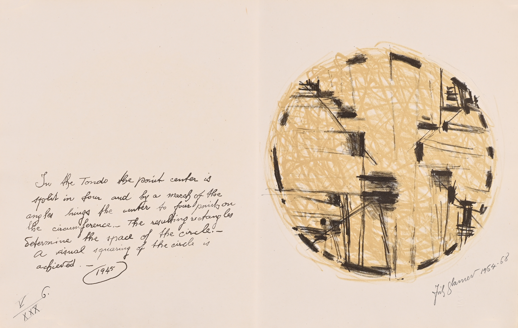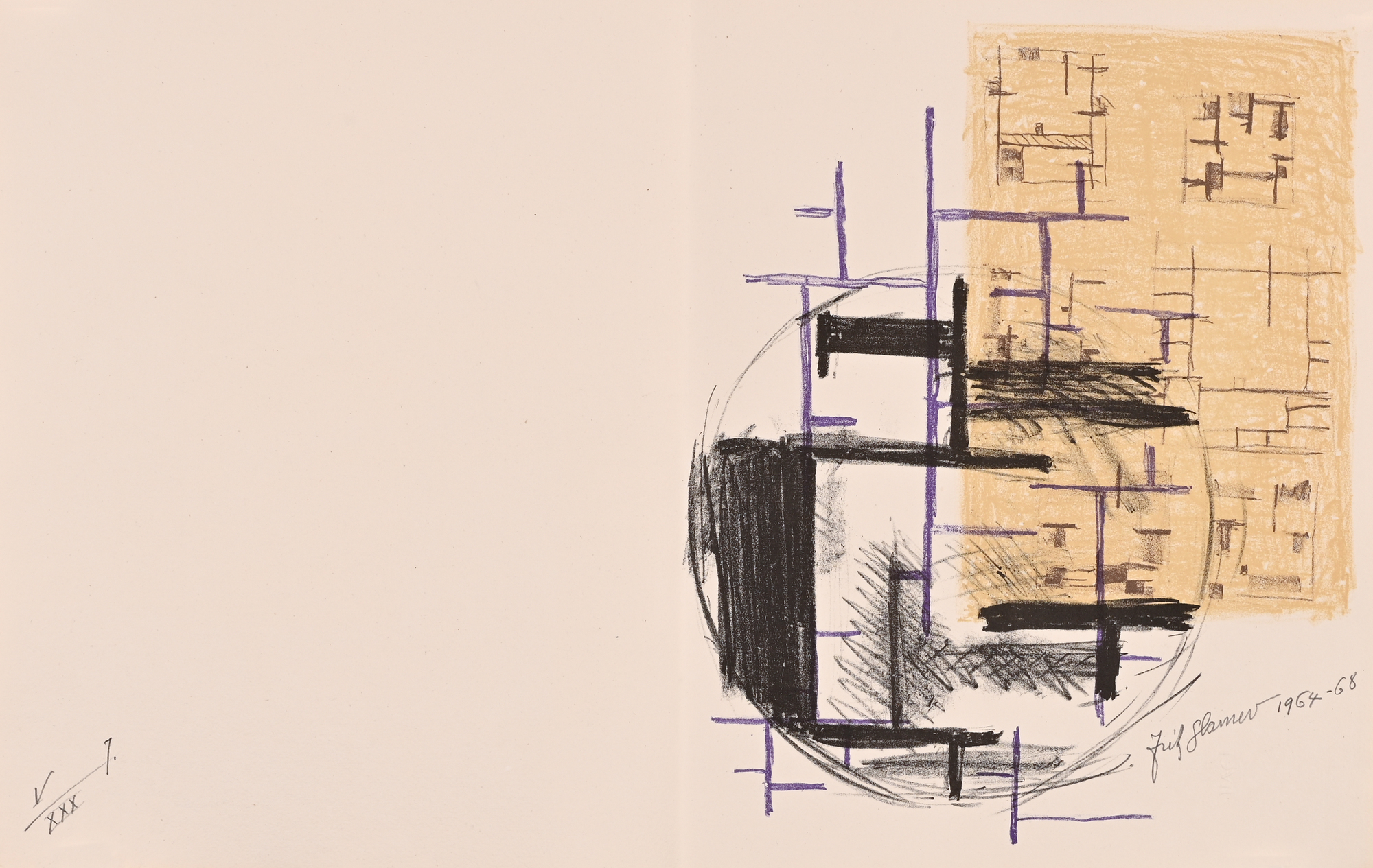 14 Lithografien auf handgeschöpftem Angoumois-Papier, davon 11 in Farbe. Alle Blätter H 360 mm B 570 mm. Auf dem Umschlag handschriftlich nummeriert: V/XXX. Jedes Blatt signiert und datiert: Fritz Glarner 1964–68. Mit Umschlag, Titelblatt und Kolophon.