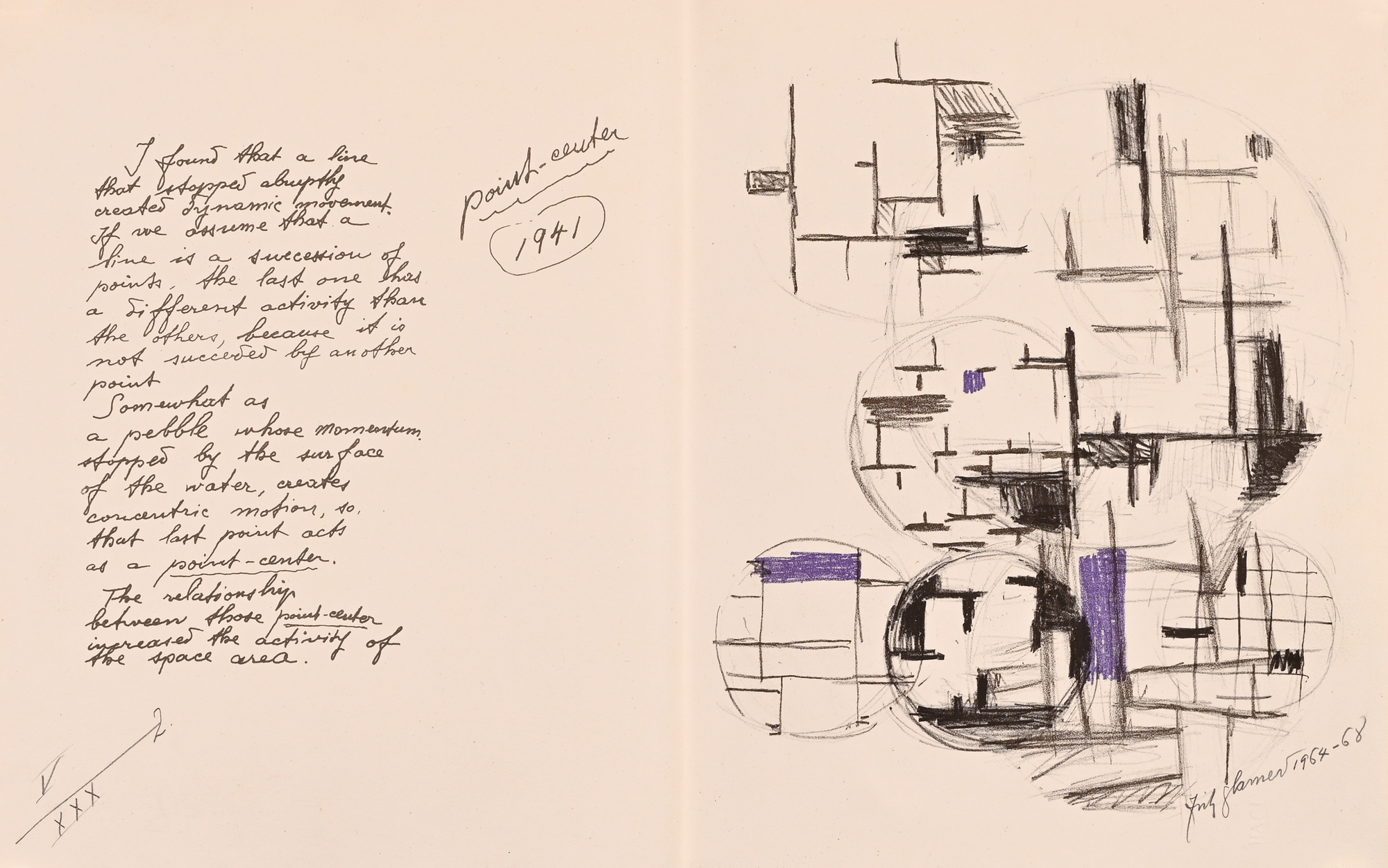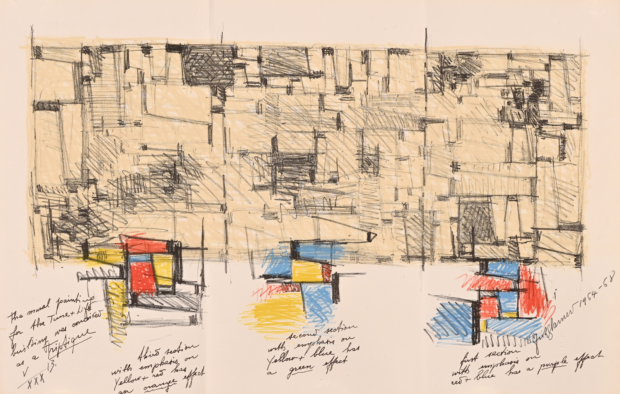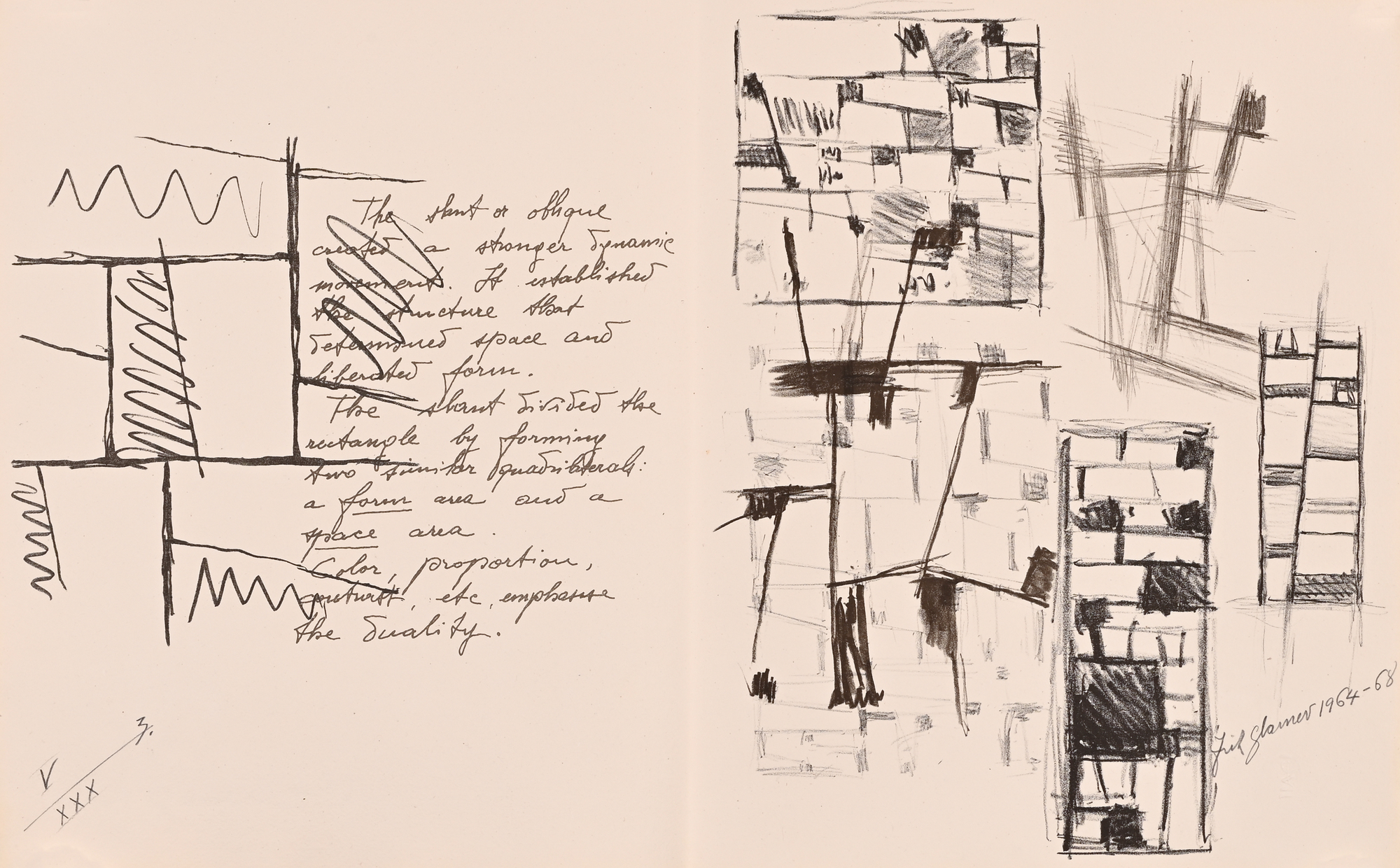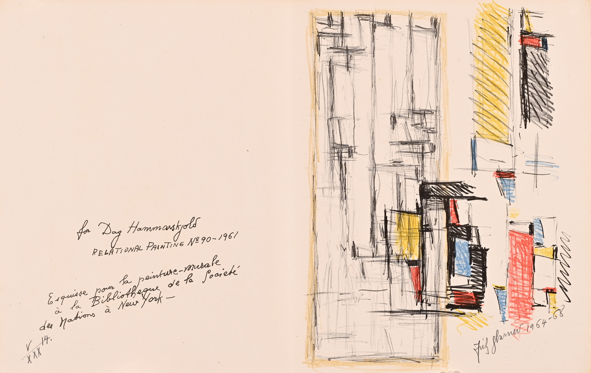 14 Lithografien auf handgeschöpftem Angoumois-Papier, davon 11 in Farbe. Alle Blätter H 360 mm B 570 mm. Auf dem Umschlag handschriftlich nummeriert: V/XXX. Jedes Blatt signiert und datiert: Fritz Glarner 1964–68. Mit Umschlag, Titelblatt und Kolophon.
