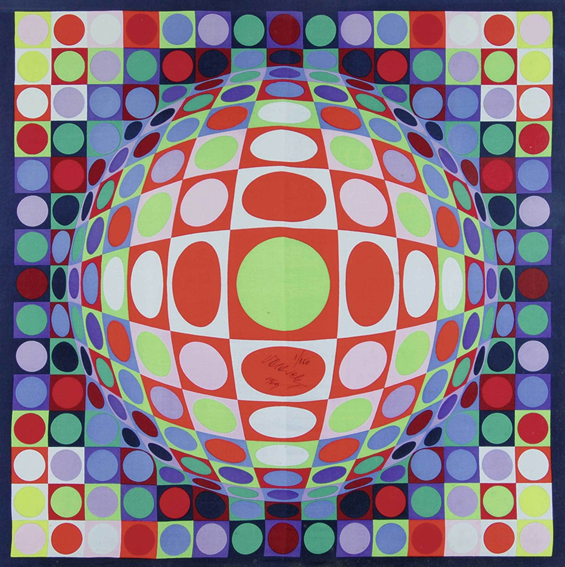 With it: Silkprint. Silkscreen printed in colors on China silk twill. H 865 mm W 865 mm. (Frame). 1/150. Signed and dated: "1969".