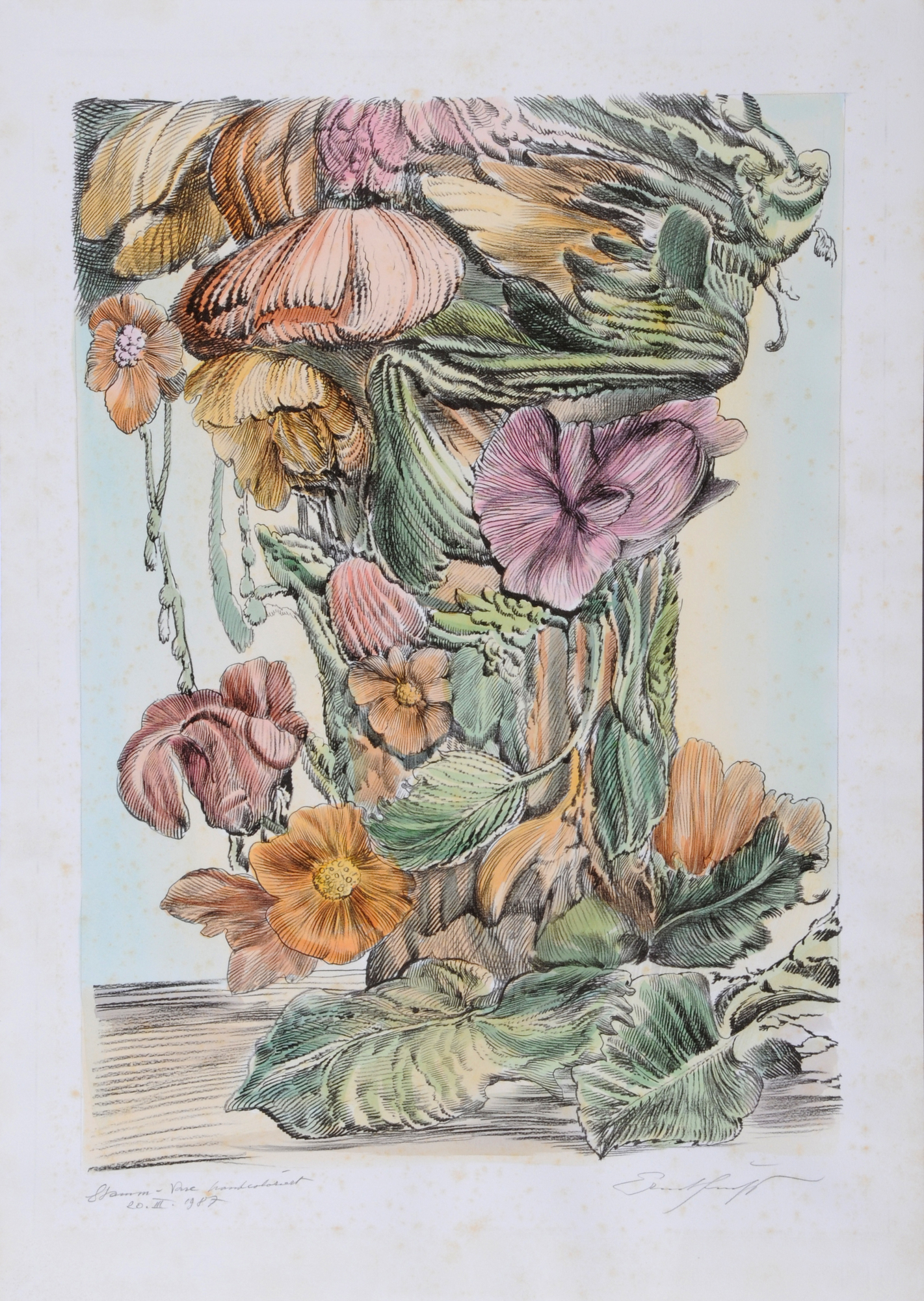 H 700 mm W 498 mm. Signed lower right: Ernst Fuchs. Titled and dated lower left: Stamm-Vase, 20.III.1987.