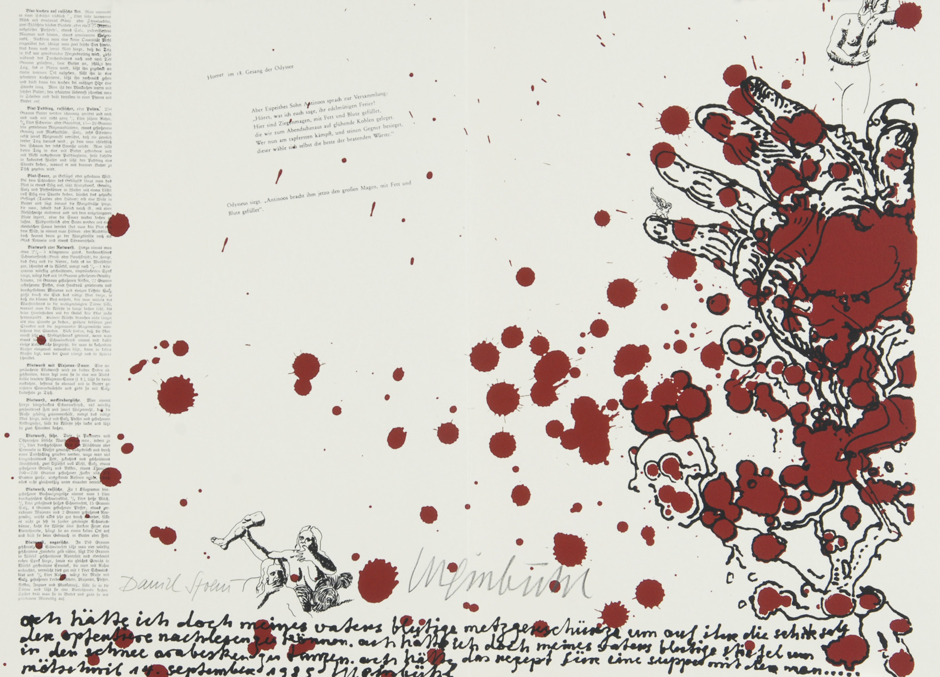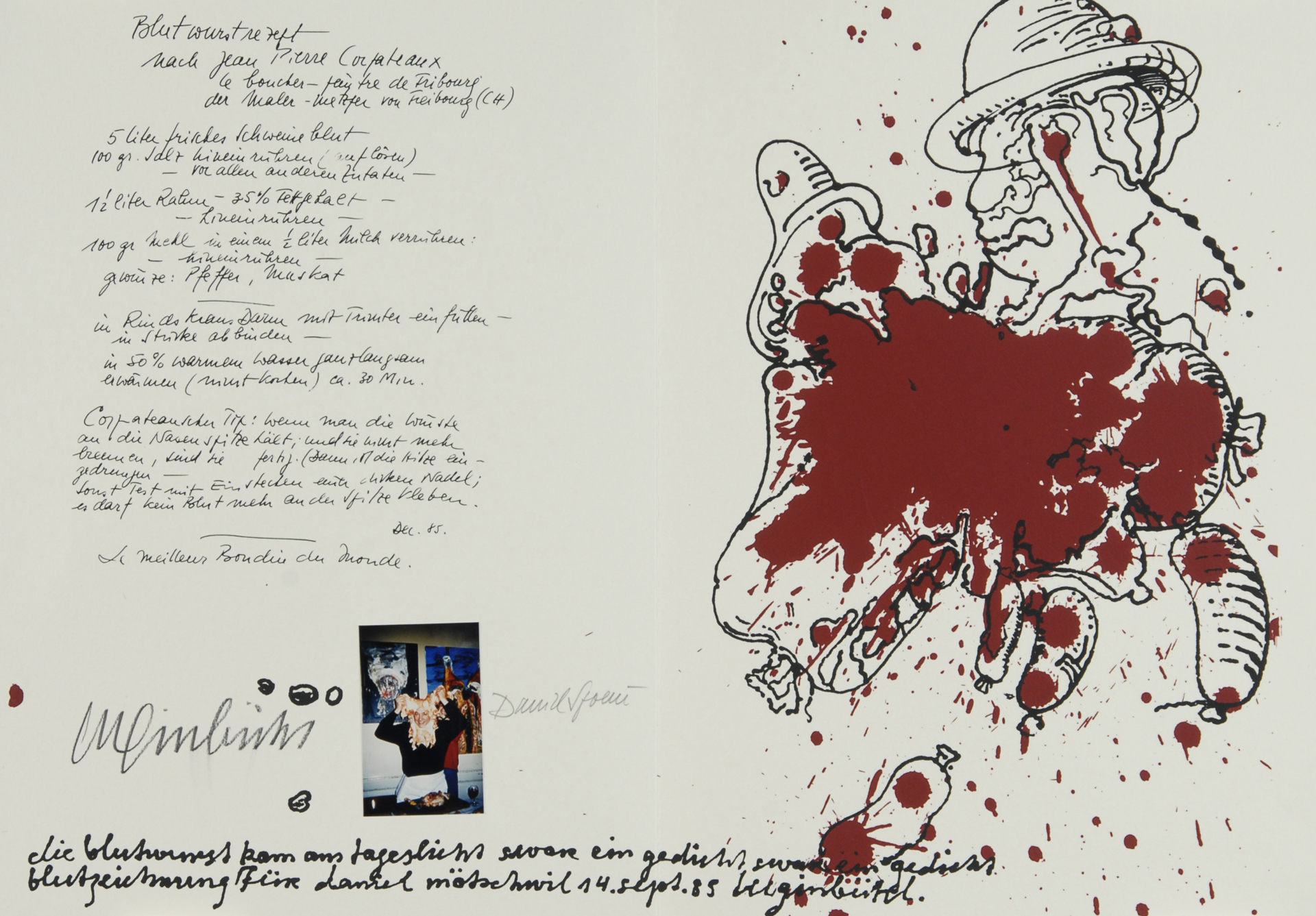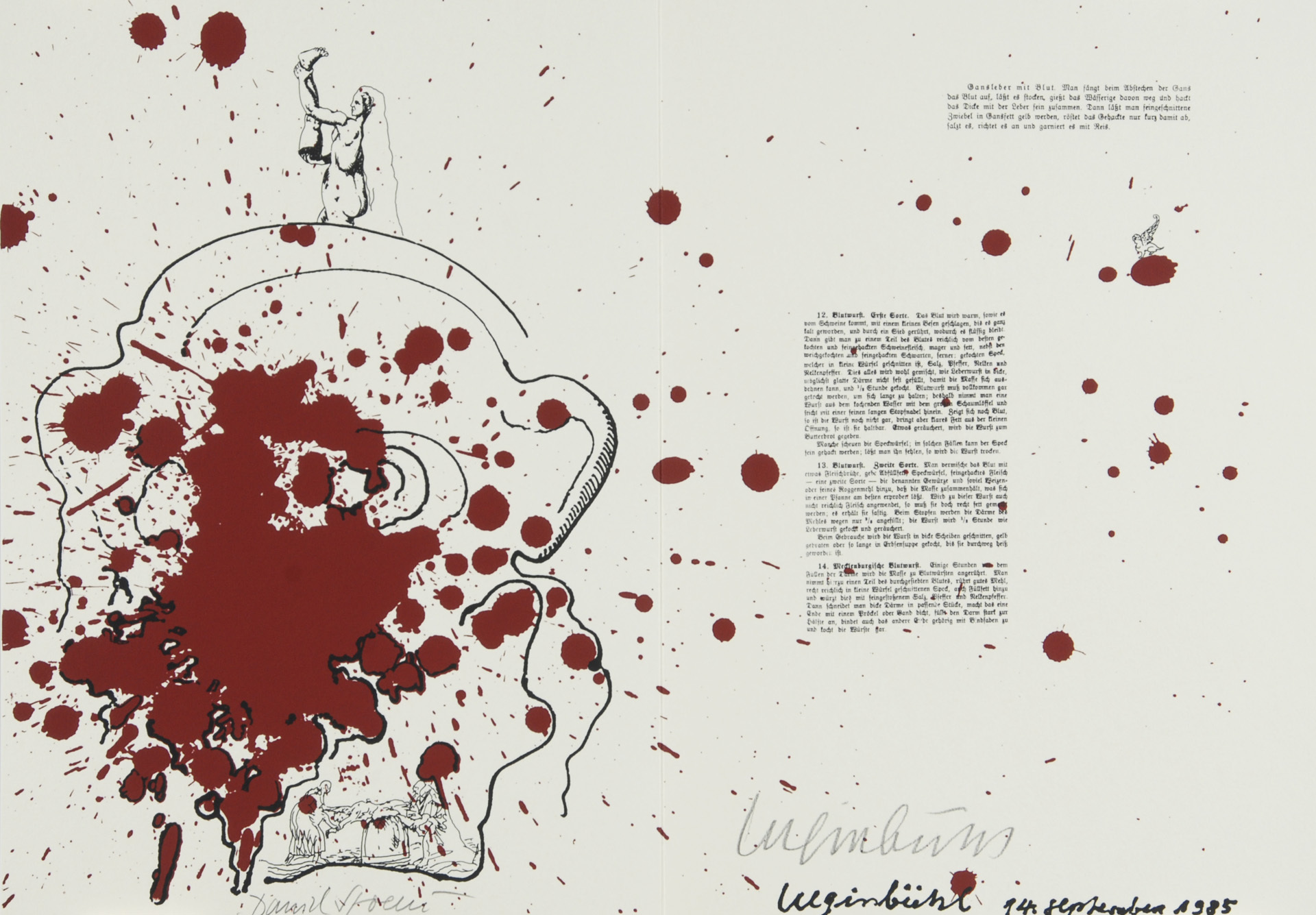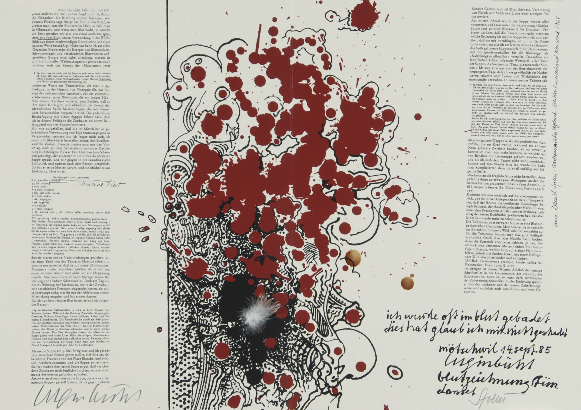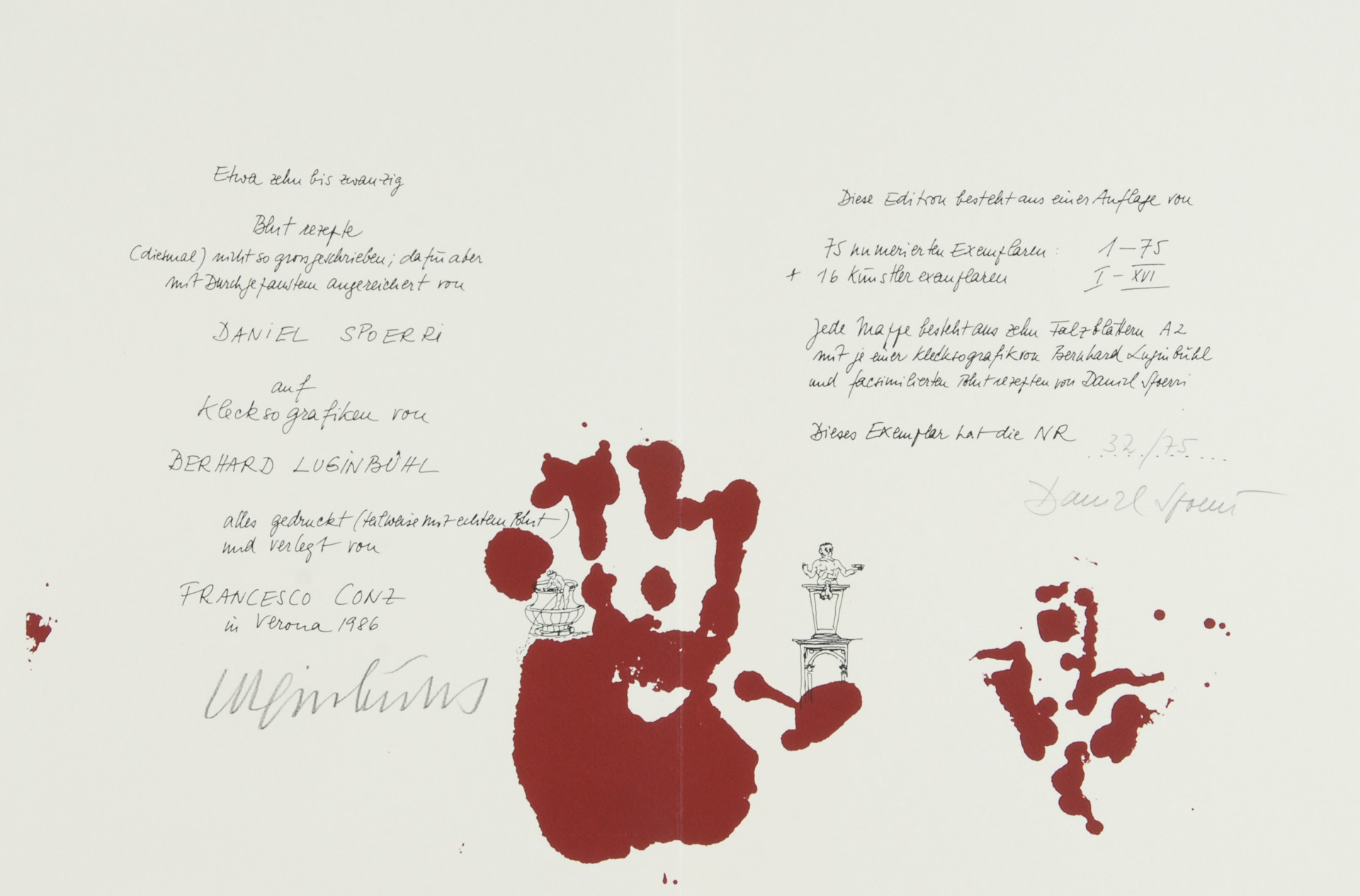 10 double pages with each one "Kleksografik" by B. Luginbühl and facsimile blood recipe by D. Spoerri, partially with real blood, 3 pages with collage.