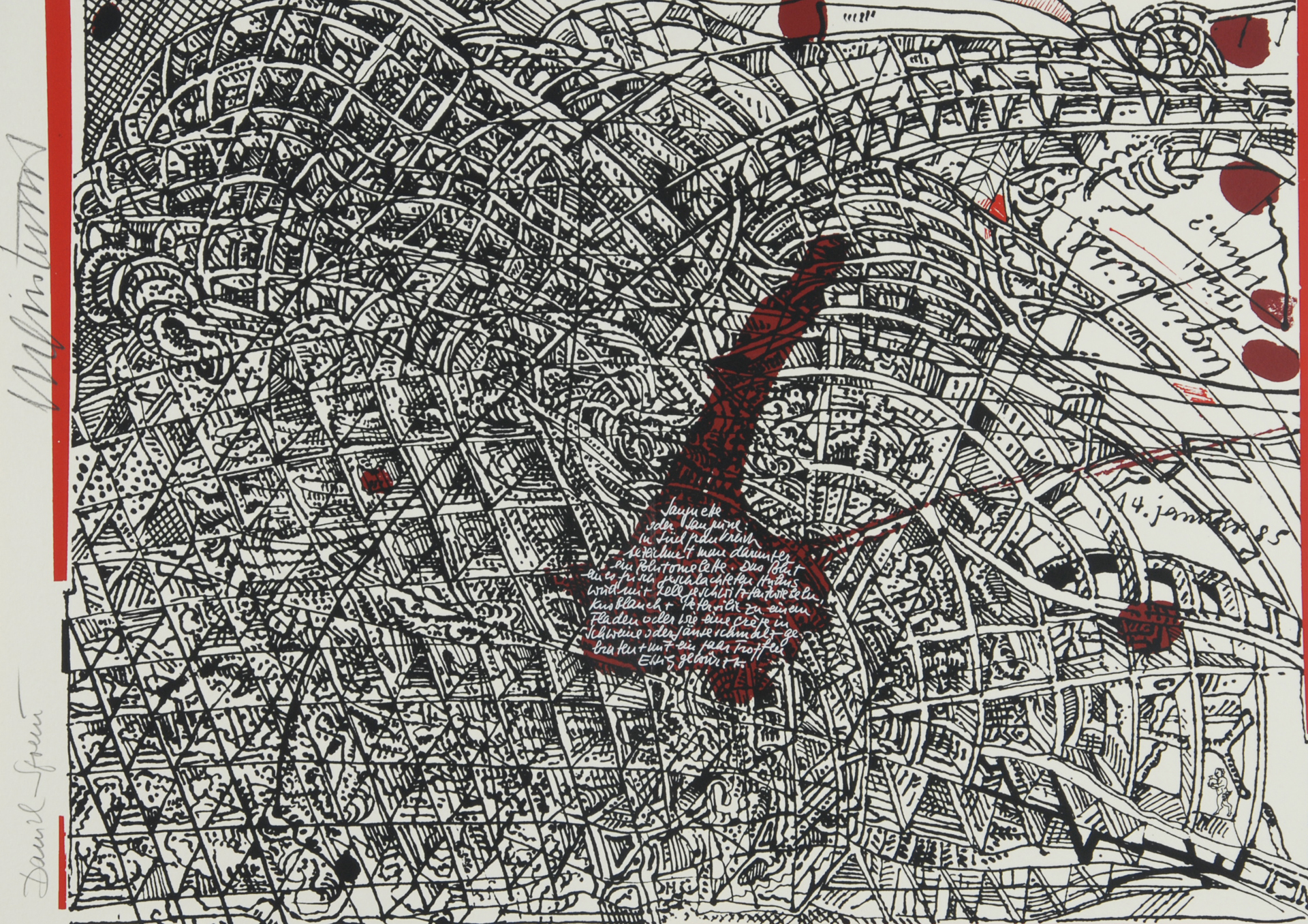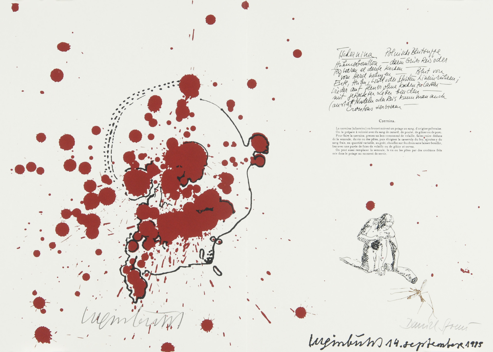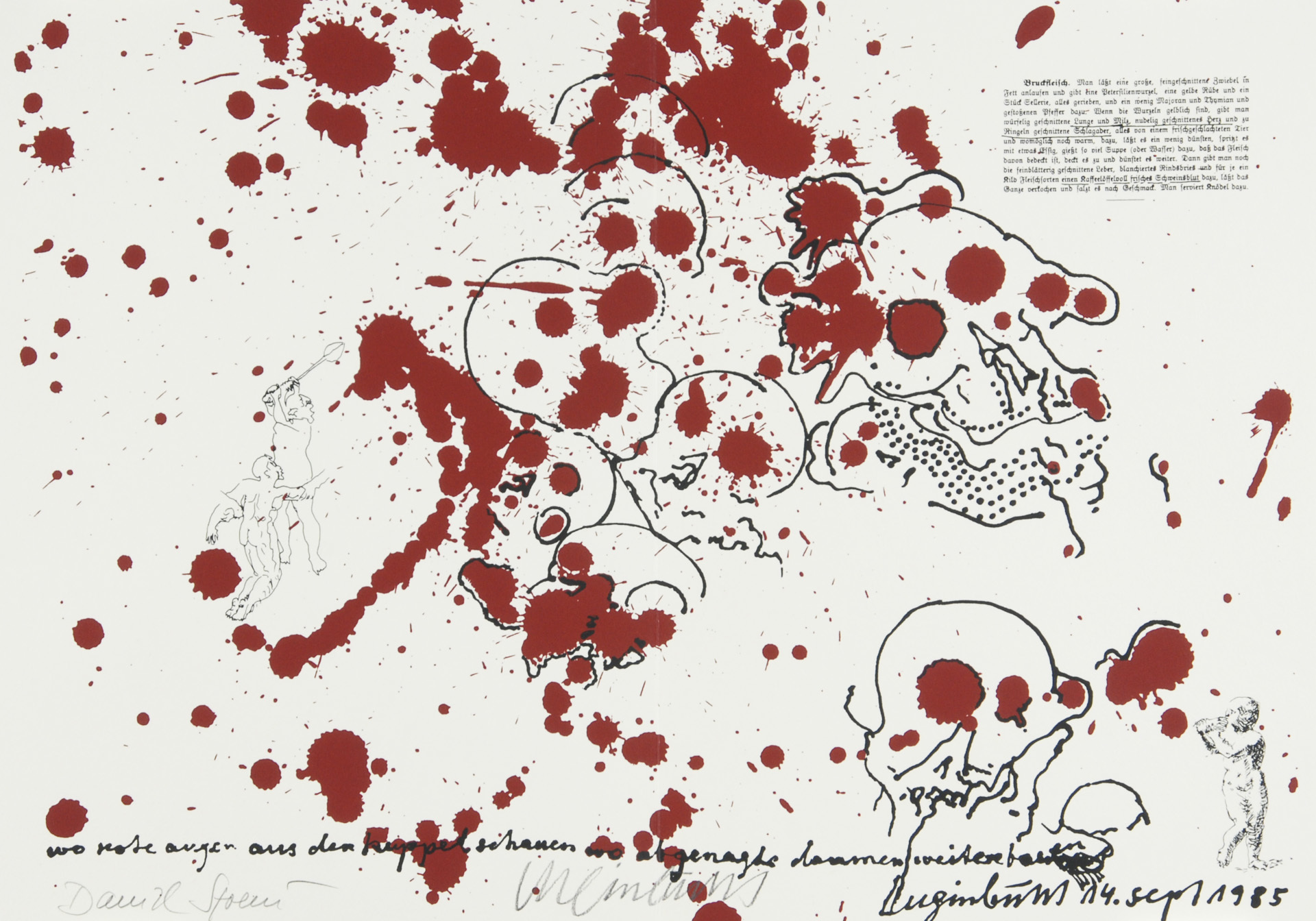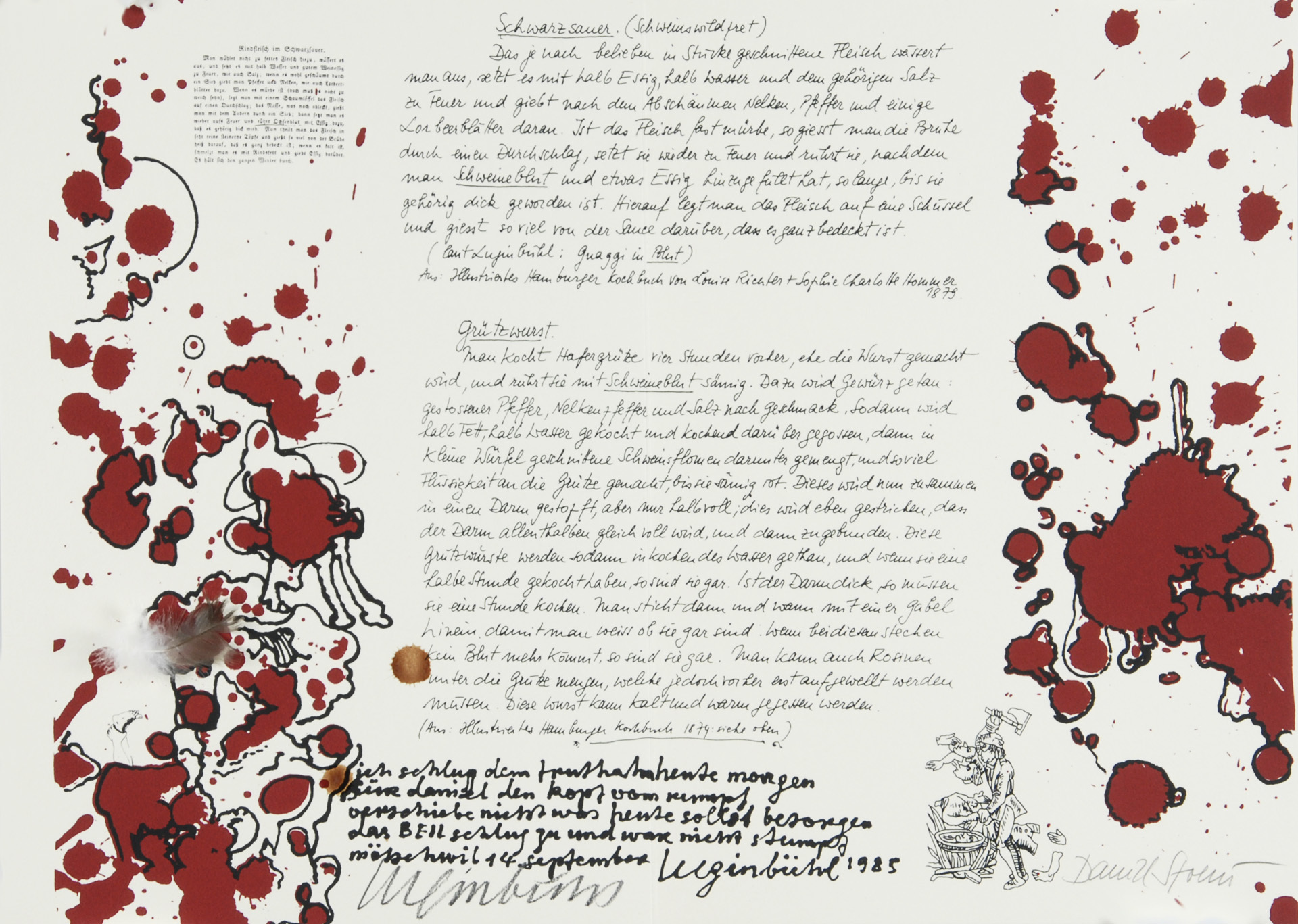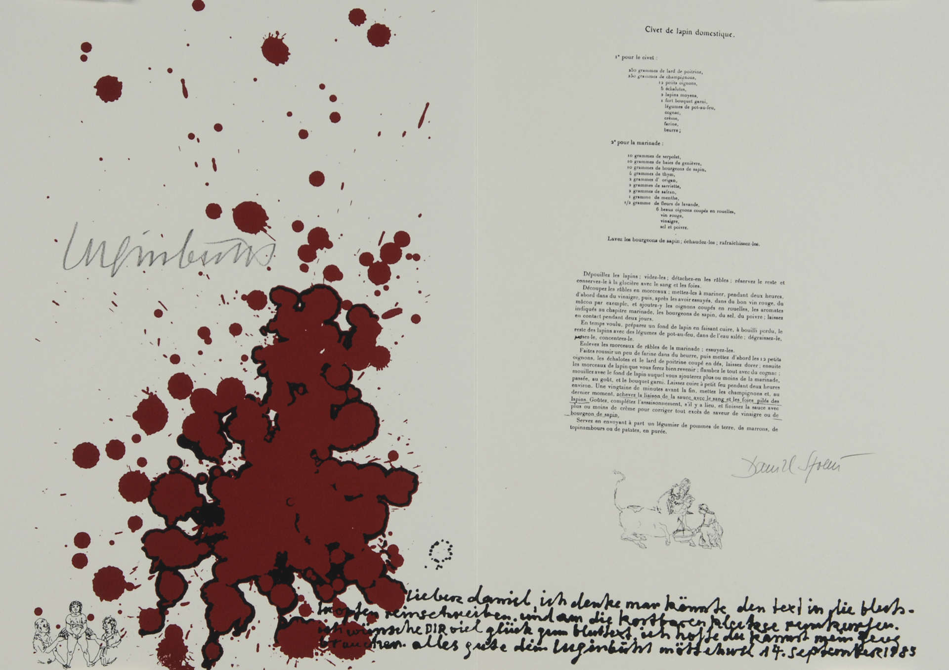 10 double pages with each one "Kleksografik" by B. Luginbühl and facsimile blood recipe by D. Spoerri, partially with real blood, 3 pages with collage.